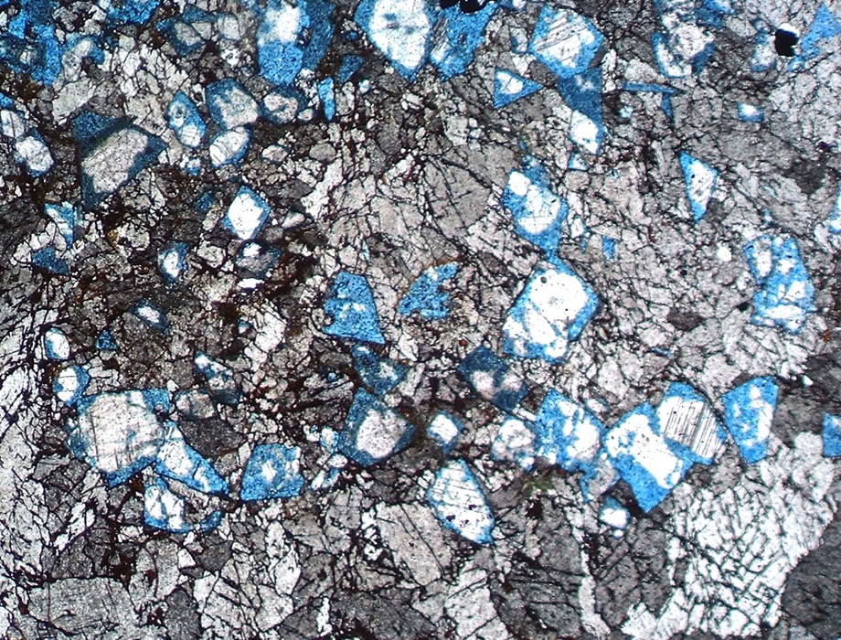 Agregado de cristales de siderita con cristales zonados automorfos de dolomita-ankerita. Lámina teñida con rojo de alizarina y ferricianuro potásico.