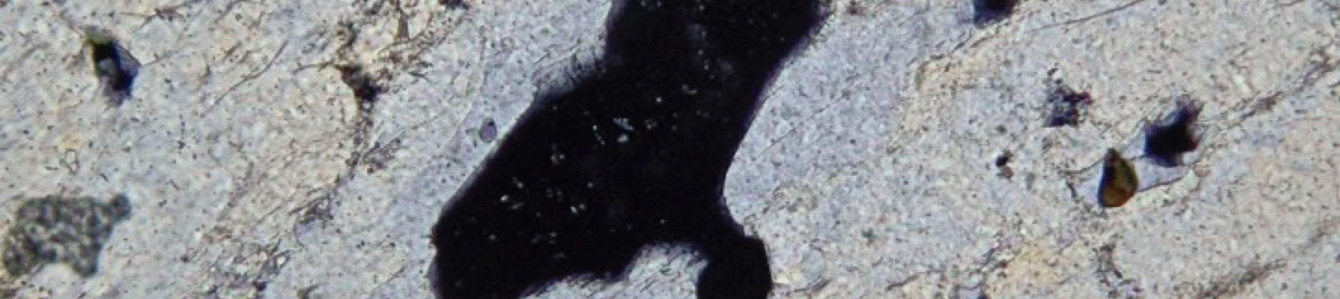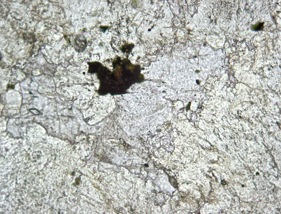 Sodalita con ligera tonalidad azulada en granos xenomorfos en una sienita (ortoclasa, apatito, biotita).