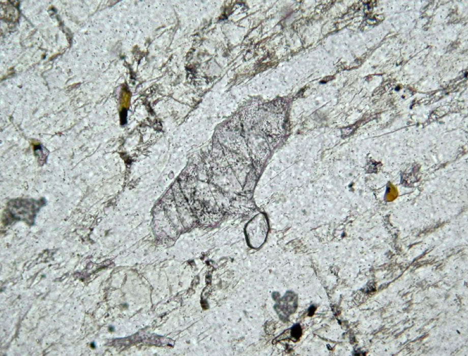 Sodalita ligeramente fracturada en sienita (augita aegirínica, ortoclasa, nefelina, apatito, titanita).