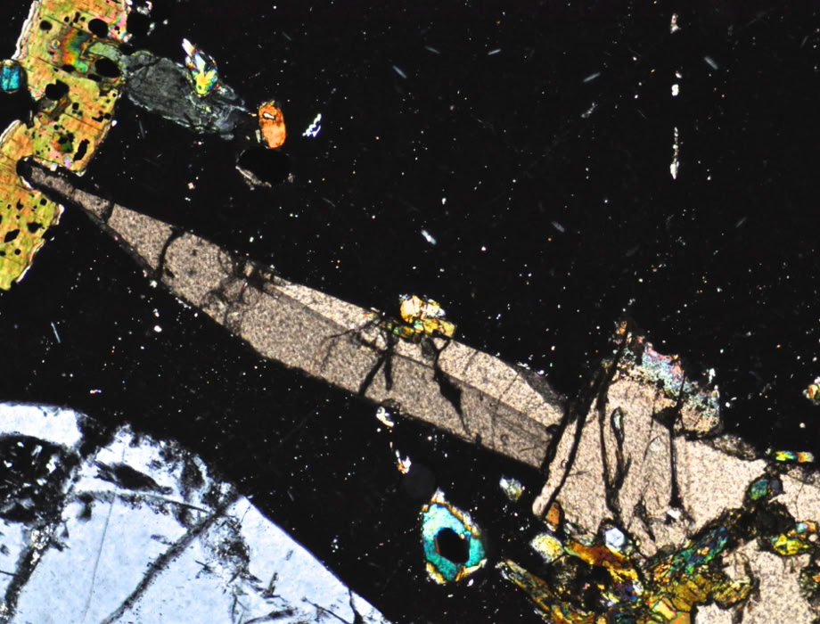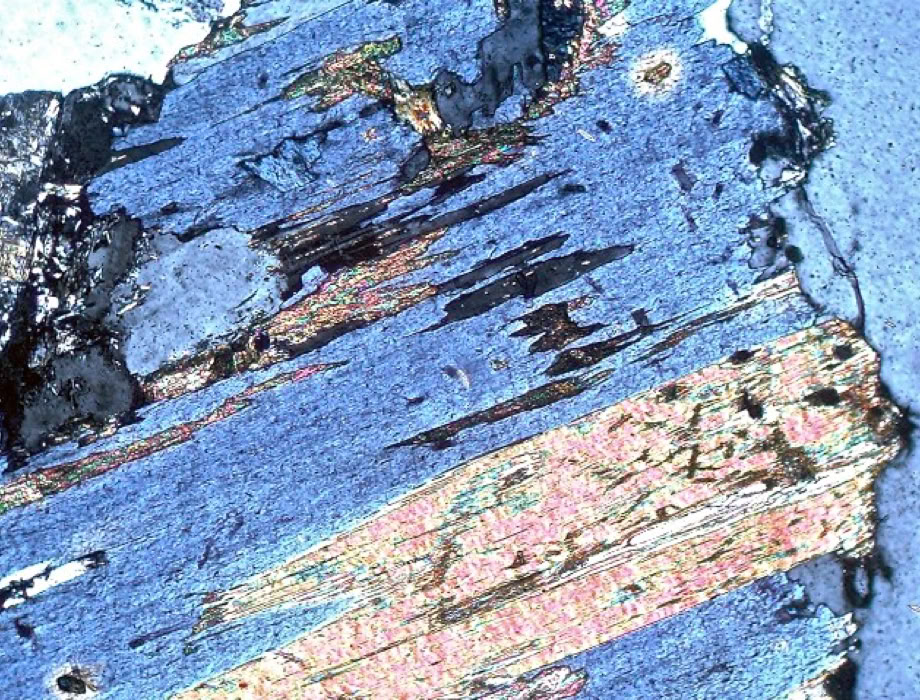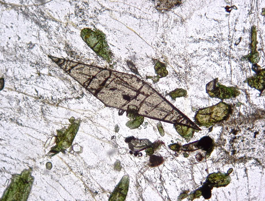 Titanita secundaria formada durante la cloritización de biotita en una granodiorita (cuarzo, plagioclasas, microclina, apatito).