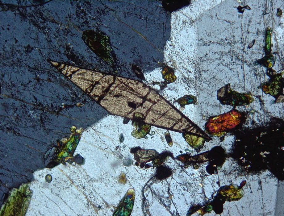 Titanita maclada incluida en sodalita en sienita nefelínica (ortoclasa, nefelina, augita aegirínica, biotita, sodalita).