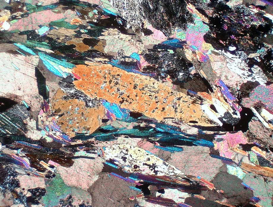 Cristales automorfos de actinolita en un esquisto (clorita, cuarzo, titanita, minerales opacos).