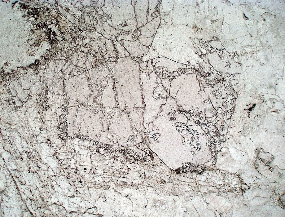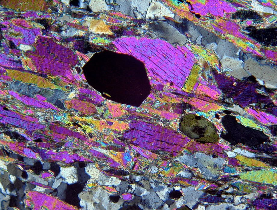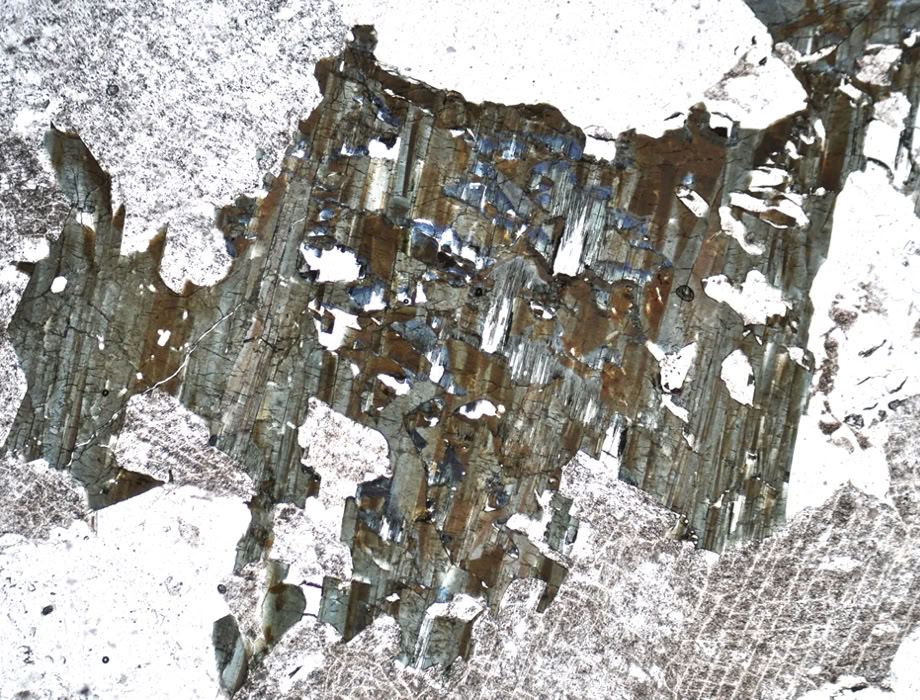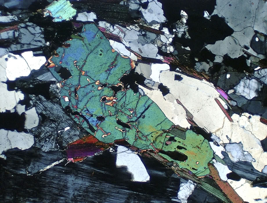 Cristal xenomorfo de turmalina (chorlo-dravita) en un gneiss (cuarzo, feldespato potásico, plagioclasa, biotita, moscovita).