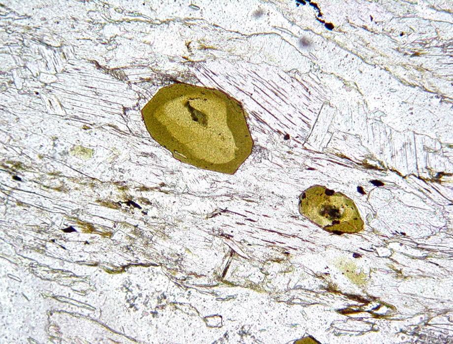 Cristales de turmalina tipo chorlo con zonaciones de color complejas en una cavidad miarolítica de una rgranodiorita (cuarzo, plagioclasa, biotita, feldespato potasico, epidota, clorita, titanita, minerales opacos, zircón).