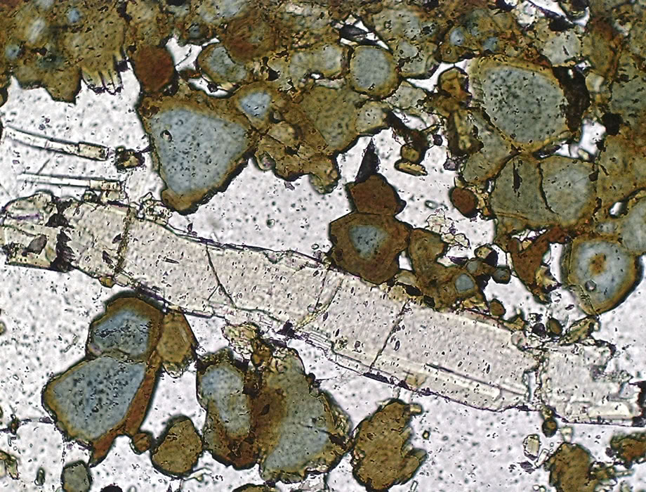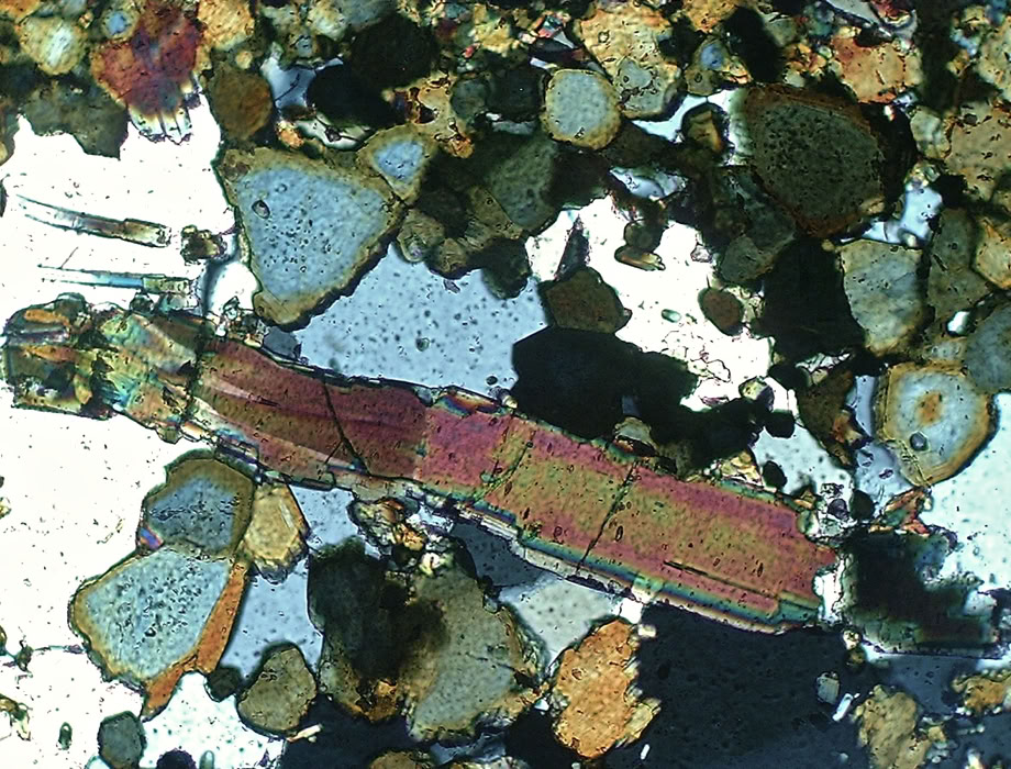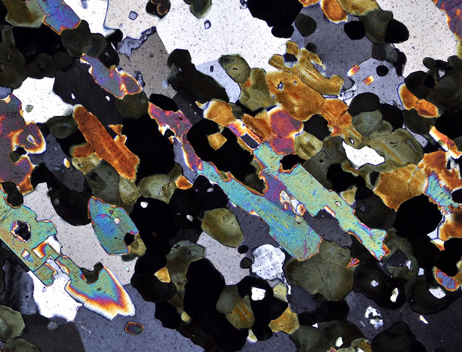Misma zona, con polarizadores cruzados. La sección basal de la imagen presenta un comportamiento isótropo.