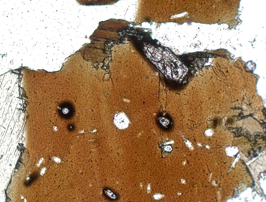 Inclusiones de zircón dando lugar a halos pleocroicos, en una biotita de una granodiorita (cuarzo. plagioclasa, microclina, apatito, clorita).
