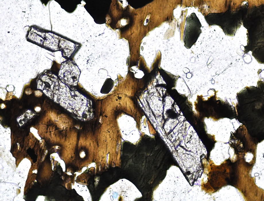 Circones automorfos, halos pleocroicos, en un granito rapakivi (feldespato potásico pertítico, plagioclasa, cuarzo, biotita, hornblenda, apatito).